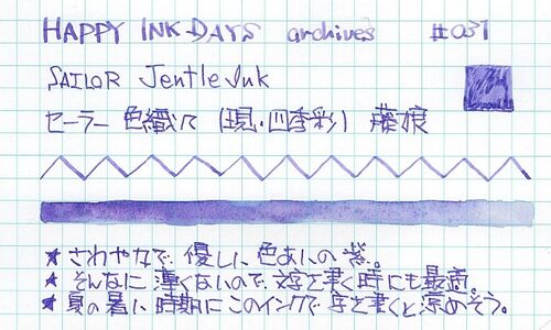 SAILOR 四季織 十六夜の夢(旧・色織々、四季彩) 藤姿(旧・藤娘) 日本の四季をモチーフにしたセーラーの全16色(4本×春、夏、秋、冬)。 この時期にぴったりの色。 薄い紫は涼し気でもあり、暑い夏の時期の服などに選んでみるのも良いだろう。 文字とし…