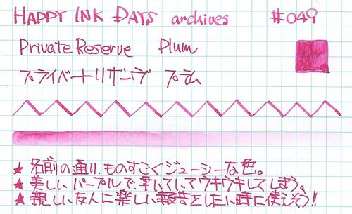 Private Reserve Plum プライベートリザーヴ プラム 前にご紹介したブルースウェードのアクセス数がものすごく高くて(いまだに伸びています) happyinkdays.hatenablog.com びっくりしてしまう、取り扱いが減りつつあるプライベートリザーヴの紫系インク。 …