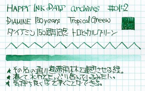 DIAMINE 150years Tropical Green ダイアミン 150周年記念インク トロピカルグリーン 2014年に150周年を迎えたダイアミンの150周年記念で発売された8色のインクのうちの一本。 ところが、なぜか、また今年、150周年記念インクが16本(日本には8本のみ入荷…