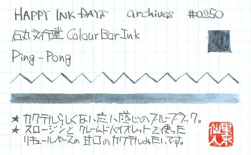 石丸文行堂 Color Bar Ink Ping-Pong 昨日に引き続き、長崎の文具店、石丸文行堂さんのオリジナルインクの紹介です。 カラーバーインクと名付けられたこのシリーズはいずれもカクテルがモチーフになっています。お酒を飲めないぼくにとっては、憧れのインク…