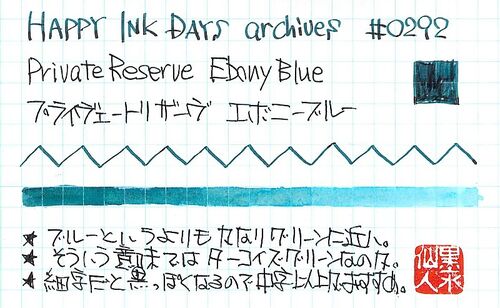 Private Reserve Ebony Blue プライヴェートリザーヴ エボニーブルー プライヴェートリザーヴは、日本での取扱店が少なくなってしまったけれども、ユニークな色が多いので、ぼくは今でも大切に使っているインクブランドのうちのひとつです。 特にこの「エボ…