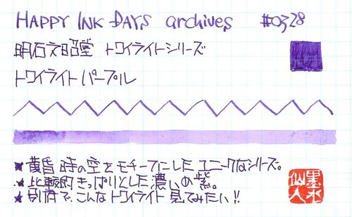 明石文昭堂 トワイライトシリーズ トワイライトパープル 昨日に引き続き、別府の文具店、明石文昭堂さんのオリジナルインクのご紹介。 今日ご紹介するのは、別府ビューシリーズではなく、もう一つのシリーズ、トワイライトシリーズです。 こちらは黄昏時の空…