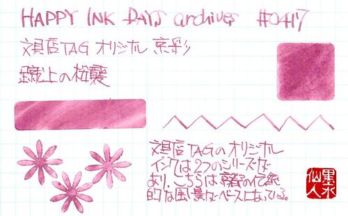 文具店TAGオリジナル 京彩 蹴上の桜襲 京都の文具店、TAGのオリジナルインク。こちらは京都の伝統的な風景がベースになっている。このピンクも非常に人気のある色で、実際に書いてみると、なぜ人気なのかがわかる。少し影があるのだ。そこがたまらない。桜っ…