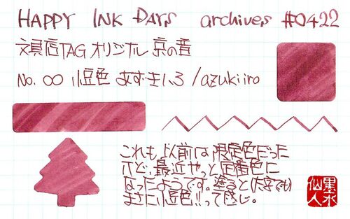 文具店TAG 京の音 小豆色 京都の文具店TAGさんのオリジナルインク。 これは京の音シリーズで、番号を見ると00番になっているんですね。試作品っていうことなのでしょうか。でも、これは限定で出ていて、ぼくはなんとか買えることができたのですが(確かこれ…