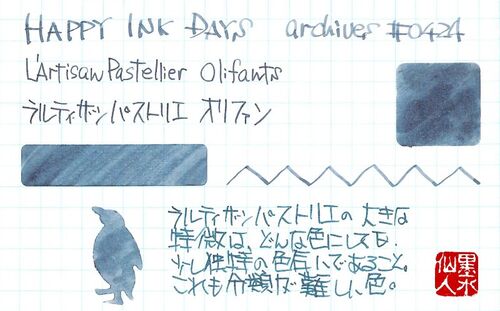 L'Artisan Pastellier Olifants ラルティザン・パストリエ オリファン うーむ。これまた微妙な難しい色。というか、こういう色、本当にお好きですね、と開発者に問いただしたい(笑)。 これは分類的に何色に入れれば良いの?と思えるようなインクが多いので…