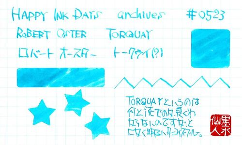 ROBERT OSTER TORQAY ロバート・オースター トーキー ロバート・オースターのターコイズ系のインクのうちの一色。上のカードを書いた後に知ったのですが、TORQAYの読み方はトーキーで、イギリスの海辺の街の名前のようですぼくはてっきりその名前からターコ…