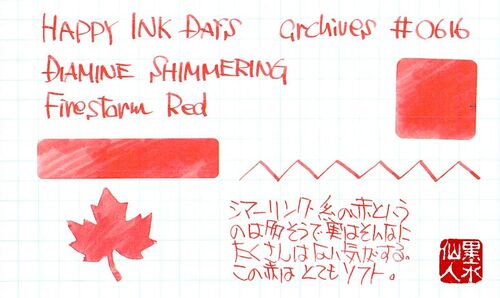 DIAMINE SHIMMERING Firestorm Red 赤系のインクというのはラメに映える気もするんだけど、実はそんなにラメ入りの赤インクというのは少ない気がする。もう、赤そのものが派手で華やかだから、わざわざラメを入れるまでもない、という感じなのだろうか。 さ…