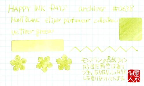 MONTBLANC elixir parfumeur collection vetiver green モンブランから今年、elixirシリーズとして、すでに3色のインクが出ていますが、さらにそのコレクションに3色が加わりました。でも、前の3色と違っているのが、香り付きであるということ。 先週、過…