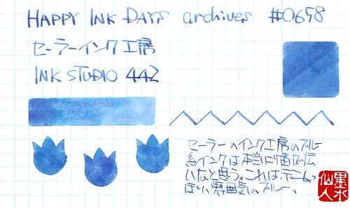 セーラーインク工房 INK STUDIO 442 青っぽいインクの中でも赤寄り(つまり紫に近い)の青と緑寄りの、いわゆるターコイズ系の色というのがある。これはどちらかというと紫寄りの色。 個人的には、そんなに積極的に使うような感じではないけれども、何となく…