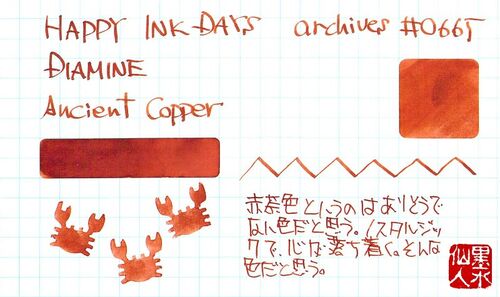 DIAMINE Ancient Copper このブログではいつも色をカテゴライズしているのですが、しばしば、この色は一体どのカテゴリーに入れたら良いのだろう?と悩むことが多い。その最たるものがターコイズ系の色なんだけど、実はその他にもカテゴライズに困る色もある…