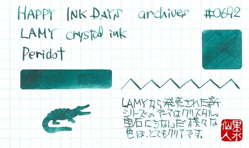 LAMY crystal ink Peridot すでに「趣味の文具箱」では紹介されているものの、まだ日本には入ってきていないラミーの新シリーズを一足早く入手できたので、ご紹介していきたいと思います。 まず、嬉しいのは30mlという量。やはりこれぐらいの量だと「使い切…