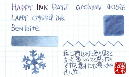 LAMY crystal ink Benitioite ラミーのクリスタルインクの面白さは、宝石に着想を得ているところなんだけど、その宝石というのが、そんなに一般的じゃないものもある。例えば、このBenitoiteもそう。日本語でもそのままベニト石と呼ばれているようなのですが…