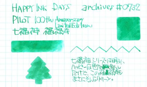 PILOT 七福神 100th Anniversary Limited Edition 福禄寿 このサンプルを作った時、ぼくはものすごく幸せな気持ちになりました。だって、本当に素敵なミントグリーンなんだもの。しかも、淡くて優しい感じがいかにも福禄寿という感じですよね。 このインクを…