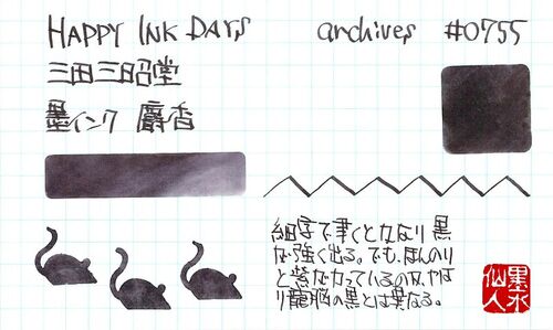 三田三昭堂 墨インク 麝香 墨インクの魅力は、香りそのものが和風というだけではなく、その色も渋いところだと思う。その香りと、色のマッチングがとても良いのだ。例えば、この麝香も、あの、ちょっと獣臭い香りとほんのりと赤みがかった色のコラボレーショ…
