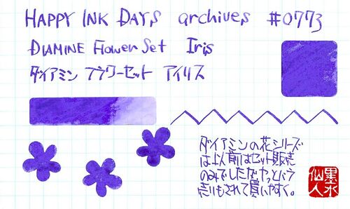 DIAMINE Flower Set Iris ダイアミン フラワーセット アイリス アイリスとは、あやめのこと。紫というイメージが強いけれども、インクの方はかなり青に近い紫。鮮やかな印象を受ける。 ありそうでない色という感じ。文字で書いても明るくて目立つので、親し…