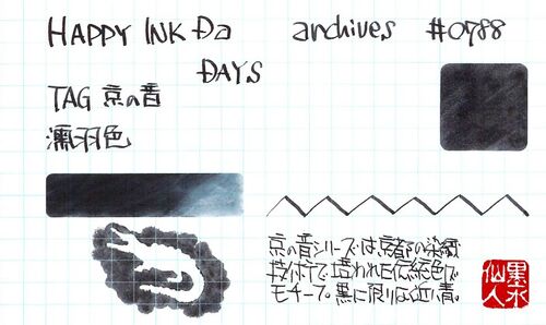 文具店TAG 京の音 濡羽色 烏の羽のような艶のある黒をイメージしたという限りなく黒に近い、ほんのり青みがかった黒という感じ。でも確かに艶やかさとか、濡れた感じがすごく伝わってくるところはすごいなと思う。 中字以上で使った方が濃淡が出やすくなり、…
