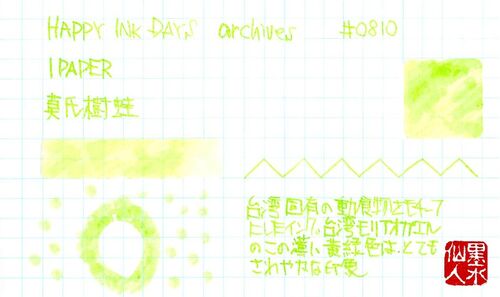 ※パッケージ、ボトルの写真は後日アップします。 IPAPER 莫氏樹蛙 台湾のアオガエルの一種。両生類がどうしても苦手なために、この色のモチーフになったのが蛙だと知り、非常に複雑な気持ちになる。 色そのものは、とても明るくてさわやかなグリーン。 ただ…