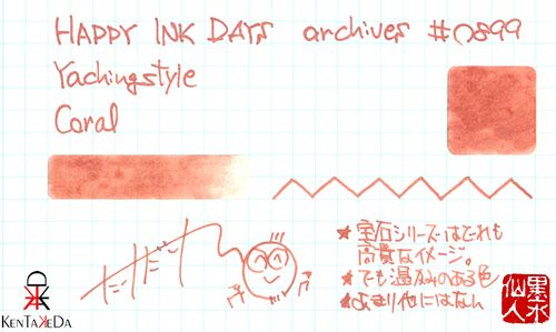 Yachingstyle Coral 台湾のジュエリーデザイナーであり、インクコレクター、万年筆愛好家でもあるヤーチン・ライさんのオリジナルインク。どれも宝石をモチーフにしているのですが、このコーラル(紅珊瑚)はとてもやさしい柔らかいオレンジです。 オレンジ…