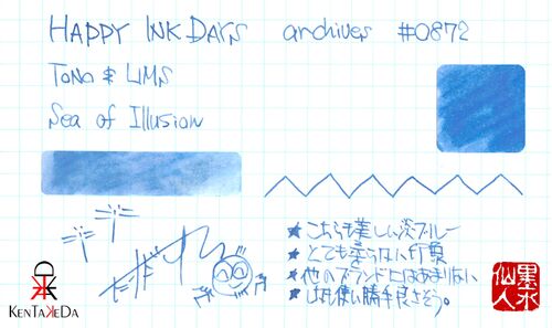 TONO&LIMS Sea of Illusion TONO&LIMSのインクの大きな特徴は淡い色が多いことというのは昨日もお伝えした通りなのですが、すごいと思うのは、鮮やかで明るい色でも淡い色が出せるということ。例えば、このブルーにしても、他のブランドだったら、もっとクリ…