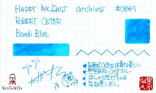 ROBERT OSTER Bondi Blue 他のブランドもそうだけれども、ROBERT OSTERも青系のインクはとても多い。しかもここの青系は結構ぼく好みの青が多くて、ついつい見とれてしまうのであります。 このBondi Blueもそんな青インクの一つ。明るいターコイズブルーで、…