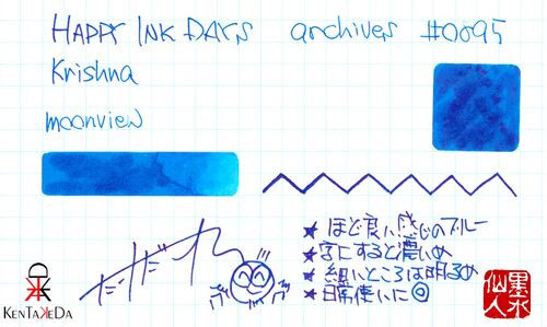 Krishna moonview インドのブランド、クリシュナインクは、インドっぽい名前のインクと英語名のインクの2種類があるような感じがする。全部を知らないので、何とも言えないのだけれども。こちらのmoonviewというインクは青色で、濃いめのターコイズブルーと…