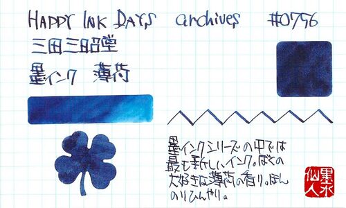 三田三昭堂 墨インク 薄荷 三田三昭堂の墨インクシリーズの中で最も新しいインク。ぼくは神戸のさんちかで行われたイベントで購入することができました。シリーズの中でぼくが一番好きな色と香りかもしれない。そして、ブルー系の黒というのがまた見事な色合…