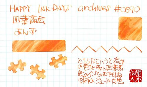 四葉商会 あんず どちらかというと渋い色の方が多い四葉商会さんのオリジナルインクですが、この色は珍しく明るくてジューシー。フレッシュな感じがします。まさにアプリコットですね。杏はジャムにしてもおいしいし、ドライフルーツにしてもおいしいと思い…