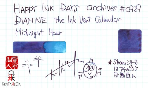 IAMINE the Ink Vent Calender Midnight Hour ネーミングの意味は、深夜の時間なんだけど、何かクリスマス的な意味合いがあるのかどうかは不明。 色は深い夜の色という感じ。シーンインクで、確かになんとなく文字の輪郭が変ではあるけど、くっきりと出てく…