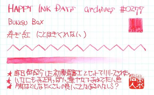 BUNGU BOX 寿ぎ紅(ことほぎくれない) 今日も昨日の「初夢青富士」に続き、ブングボックスさんのお正月限定インクです。 この二本は同時に発売されたのですが、こちらの赤い方がお正月らしさが強く強調されているような気がします。名前からしておめでたい…