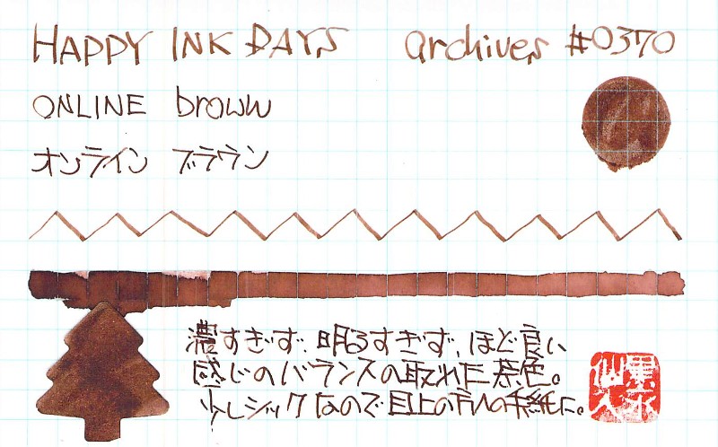 最近パッケージをリニューアルし、さらに同じ色で香り付きのインクも出したオンラインのボトルインク。こちらは茶色系の比較的おとなしめの色。