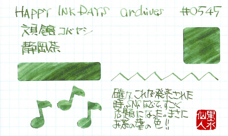 それだけのことはあり、このインク、実に忠実にお茶の緑を再現しています。緑って非常に微妙な色で、一歩間違えるとくすんでしまって抹茶っぽくなるんですが、これはそんなに抹茶抹茶していなくて、絶妙なバランスを保っているグリーンなのではないでしょうか。