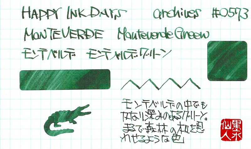 モンテベルデのインクは全体的に緑系のインクが他のブランドと比べると多いような気がする。この緑はそんな中でも特に濃い緑。ダークグリーンというほどではないけれども、しっかりと山の緑を連想させる色になっている。