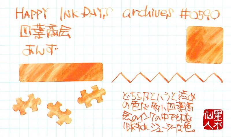 2018-11-11 #0590 四葉商会 あんず Inks-インク- Orange-橙- 国産 御当地インク 四葉商会 四葉商会 あんず どちらかというと渋い色の方が多い四葉商会さんのオリジナルインクですが、この色は珍しく明るくてジューシー。フレッシュな感じがします。まさにアプリコットですね。杏はジャムにしてもおいしいし、ドライフルーツにしてもおいしいと思いますが、このインクは果たして、どの過程の杏でしょうか。そんなことを思いながら文字を書いてみるのも面白いかもしれません。ほんのりと黒っぽいので判読性にも優れ、なかなか良い黄色だと思います。