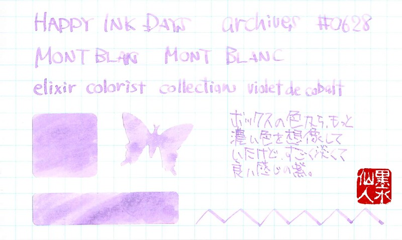 ボックスの隙間から見える紫色から、この色はきっと濃い紫だろうと勝手に想像していたのですが、意外にも実際のインクは薄くてびっくり。かなり淡い感じの紫です。ペン先の太さによっては、判読性が低いんじゃないかと思ってしまうほど。