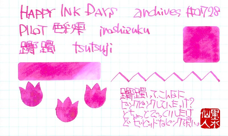 で、このインクはその色を再現しているということなんだけど、ぼくの記憶の中の躑躅って、もう少しこうくすんだピンクという感じがする。色は濃いめなんだけど、ちょっともやがかかっているというか。