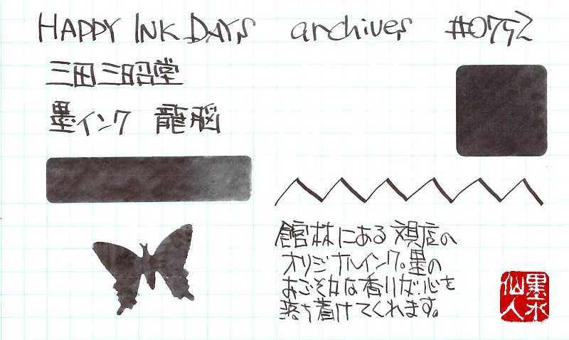 墨汁のような香りがするのかと思ったら、もっとエレガントというか、落ち着いたお香のような香りがして、すごく癒されたのを良く覚えている。実際に製品になったインクも同じような香りがして、書いている間、とても気持ちが良くなります。香りの持続性そのものはそんなに強くはないので、例えばこれで手紙を書いて相手にそれが伝わるか、というと非常に微妙。