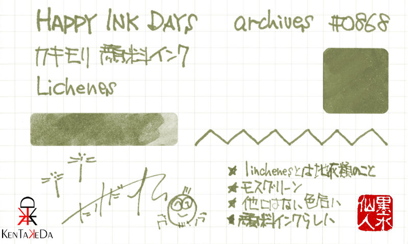 Lichinesとは、地衣類のことで、わかりやすく言うと苔。つまりこれはモスグリーンになる。ただ、染料系のインクと違って、マット感が出るので、濃厚な感じのモスグリーンのように見える。みずみずしさというよりも、もっこり感というか。そんな感じだろうか。
