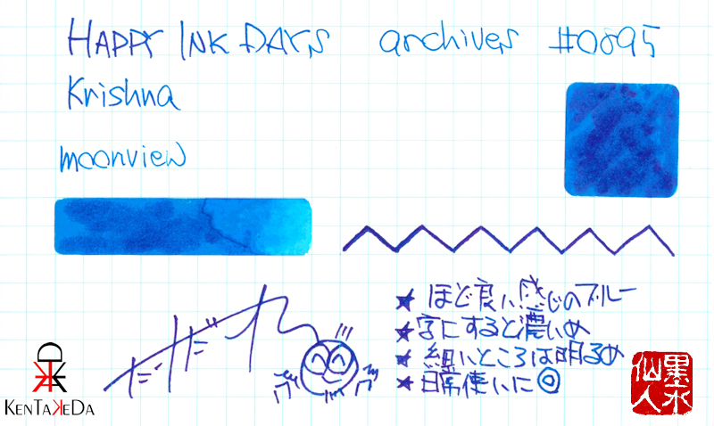 インドのブランド、クリシュナインクは、インドっぽい名前のインクと英語名のインクの2種類があるような感じがする。全部を知らないので、何とも言えないのだけれども。こちらのmoonviewというインクは青色で、濃いめのターコイズブルーといったところだろうか。月というのは、様々な色に変化するんだけど、基本的な黄色、金色の月の他に青っぽい月もあり、そういった色をモチーフにしたインク(KEN'S NIGHTのBlue Moonもまさにそんな青い月をイメージしているわけだけど)も多い。